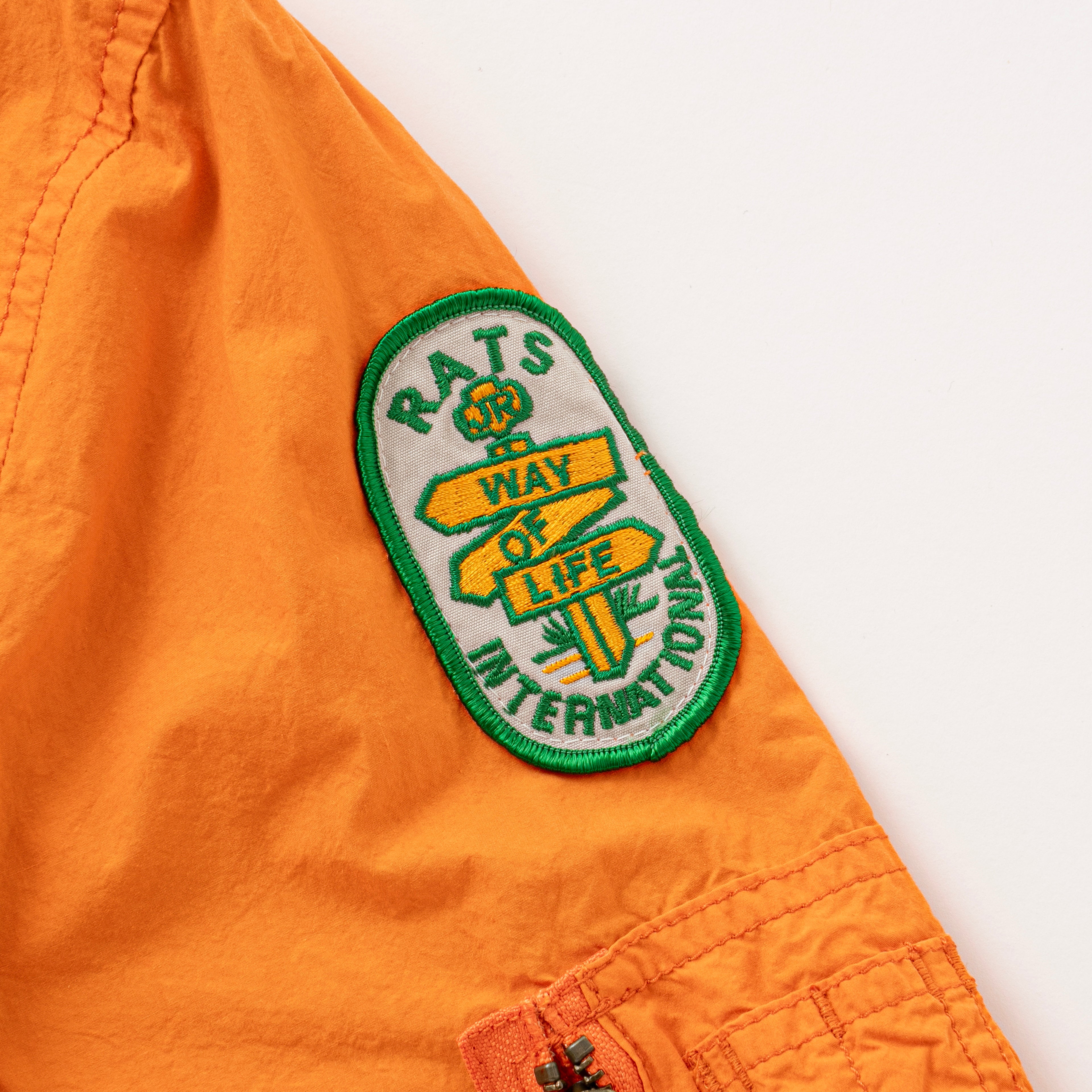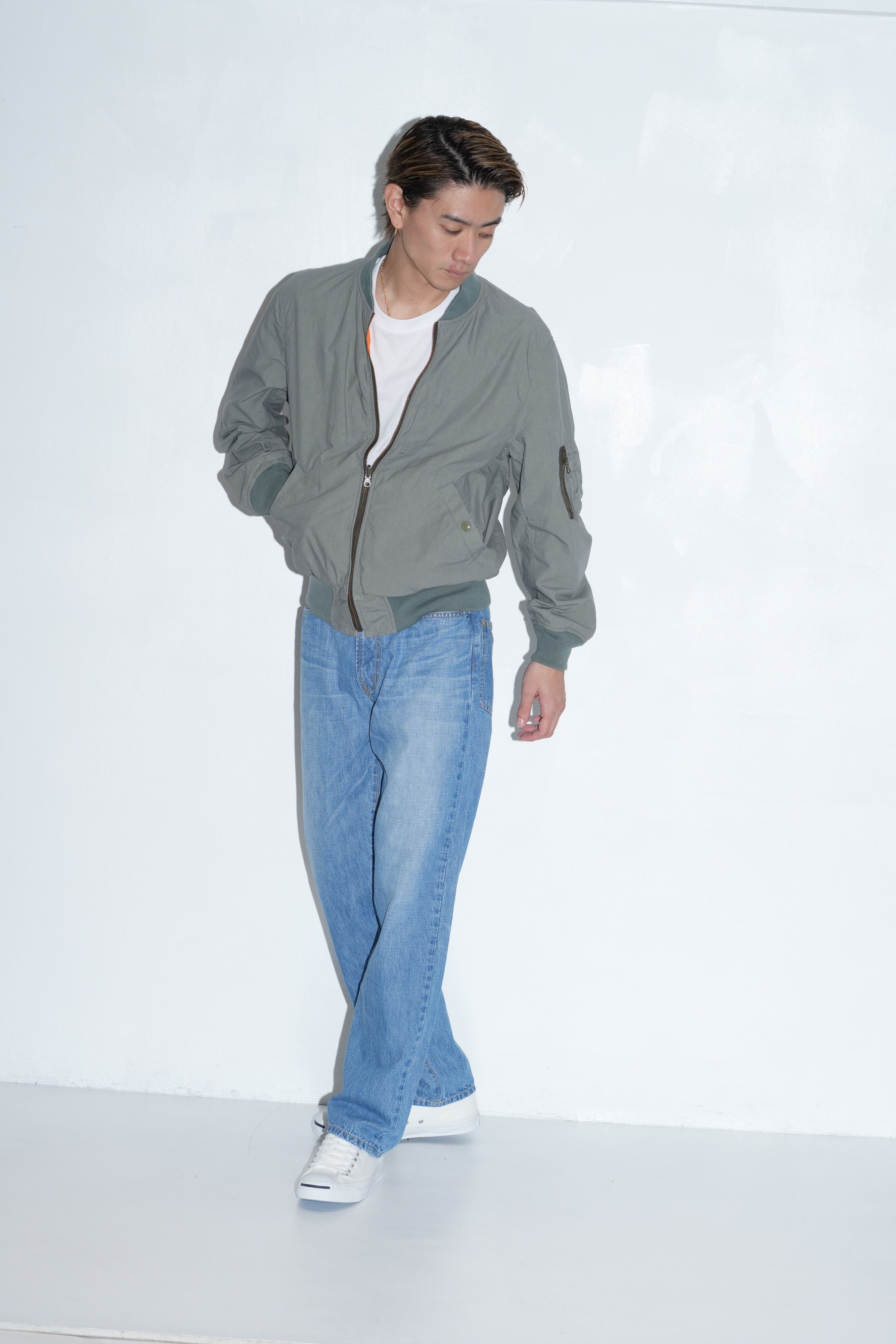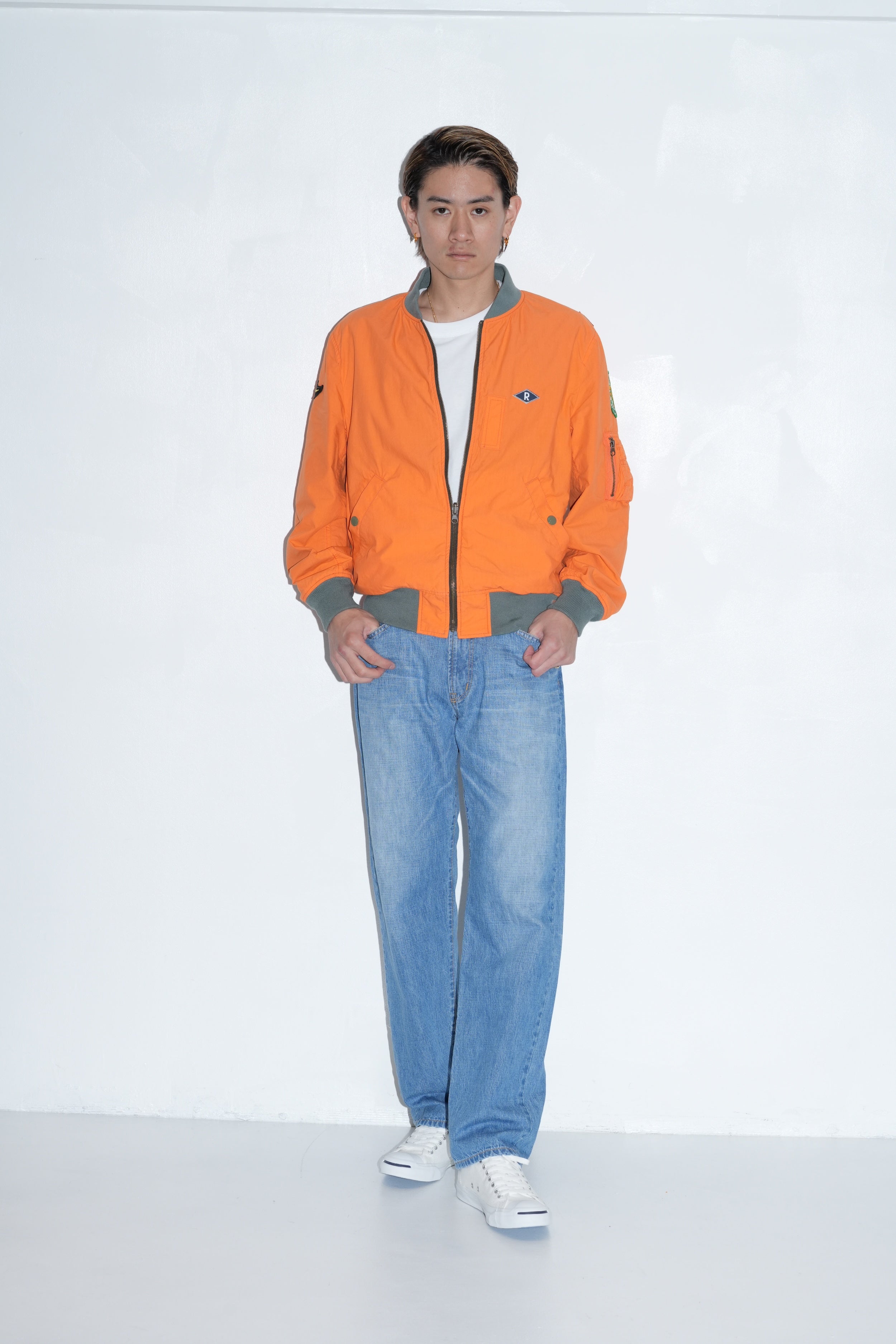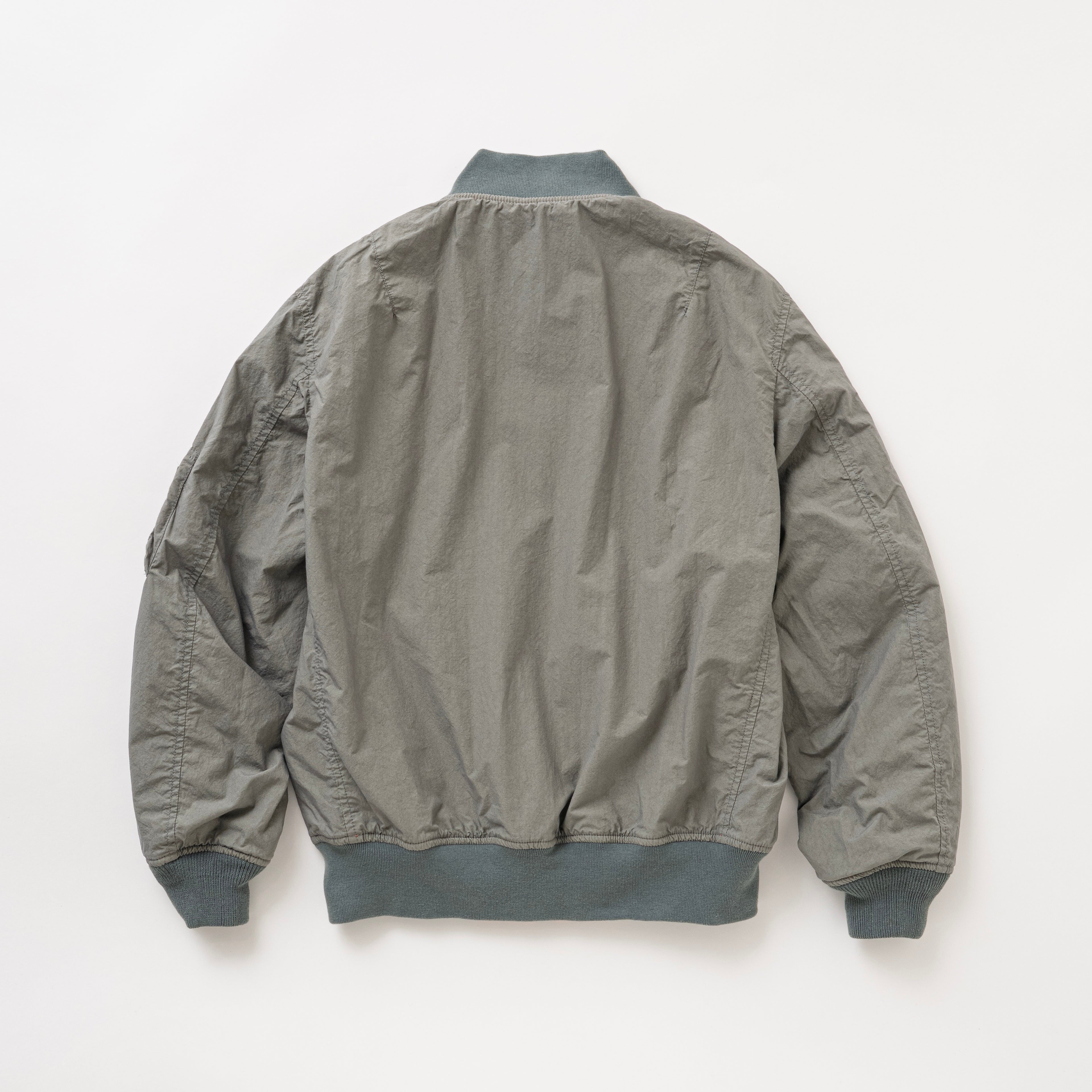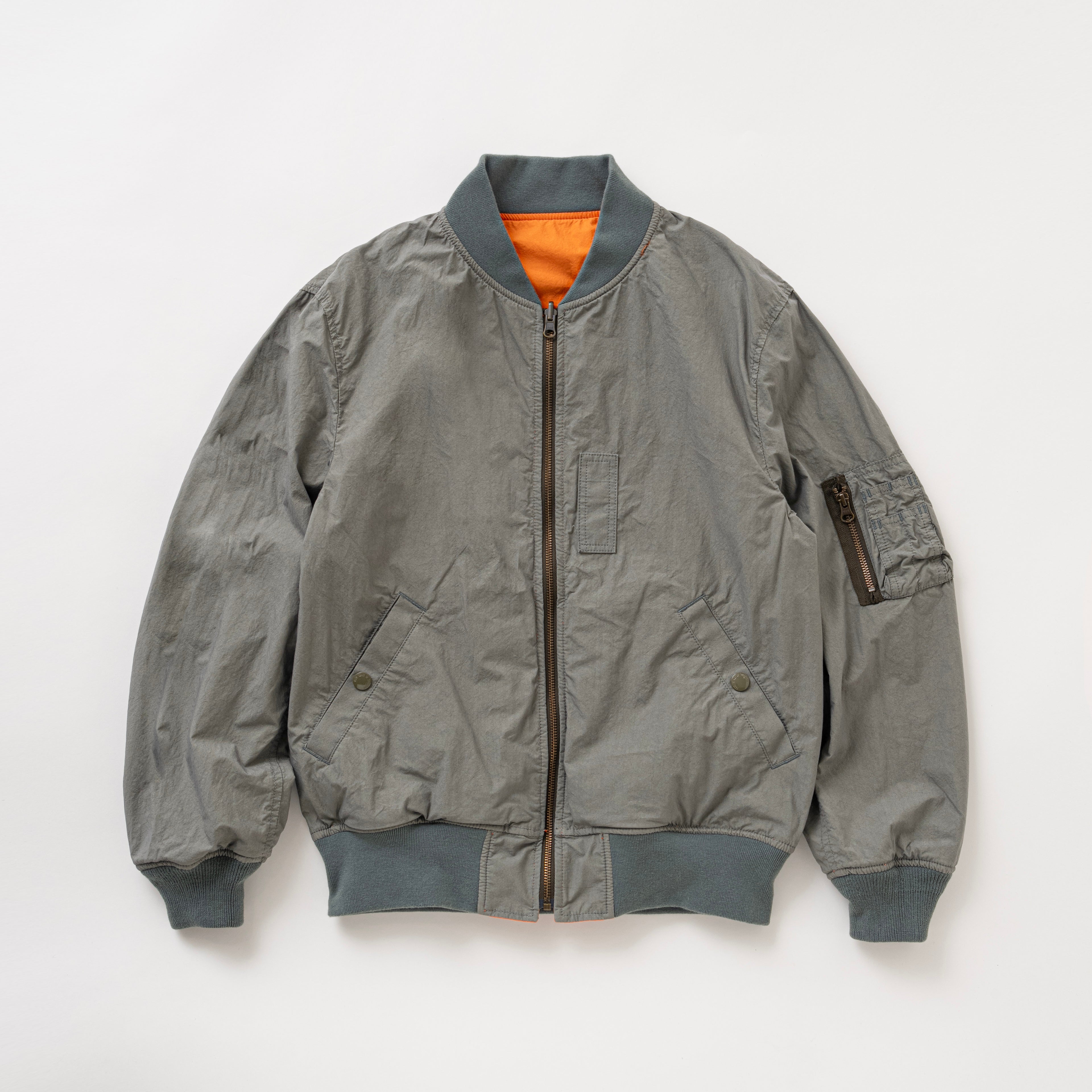 オリジナルで染色したコットンタイプライター素材を使用したMA-1ジャケット。オレンジ面・グレー面の両A面のデザインで構成したリバーシブル仕様。中綿を入れないことでライトに羽織ることが可能。オレンジ面は左胸、両肩、両袖にオリジナルで作成したワッペンが配置、グレー面は装飾を廃してソリッドに仕上げてある。左腕にシガレットポケット、身頃の両脇にスラッシュポケット、胸元のオキシジェンタブは両面ともに共通の意匠。レギュラーフィットシルエット。1色、5サイズ展開。