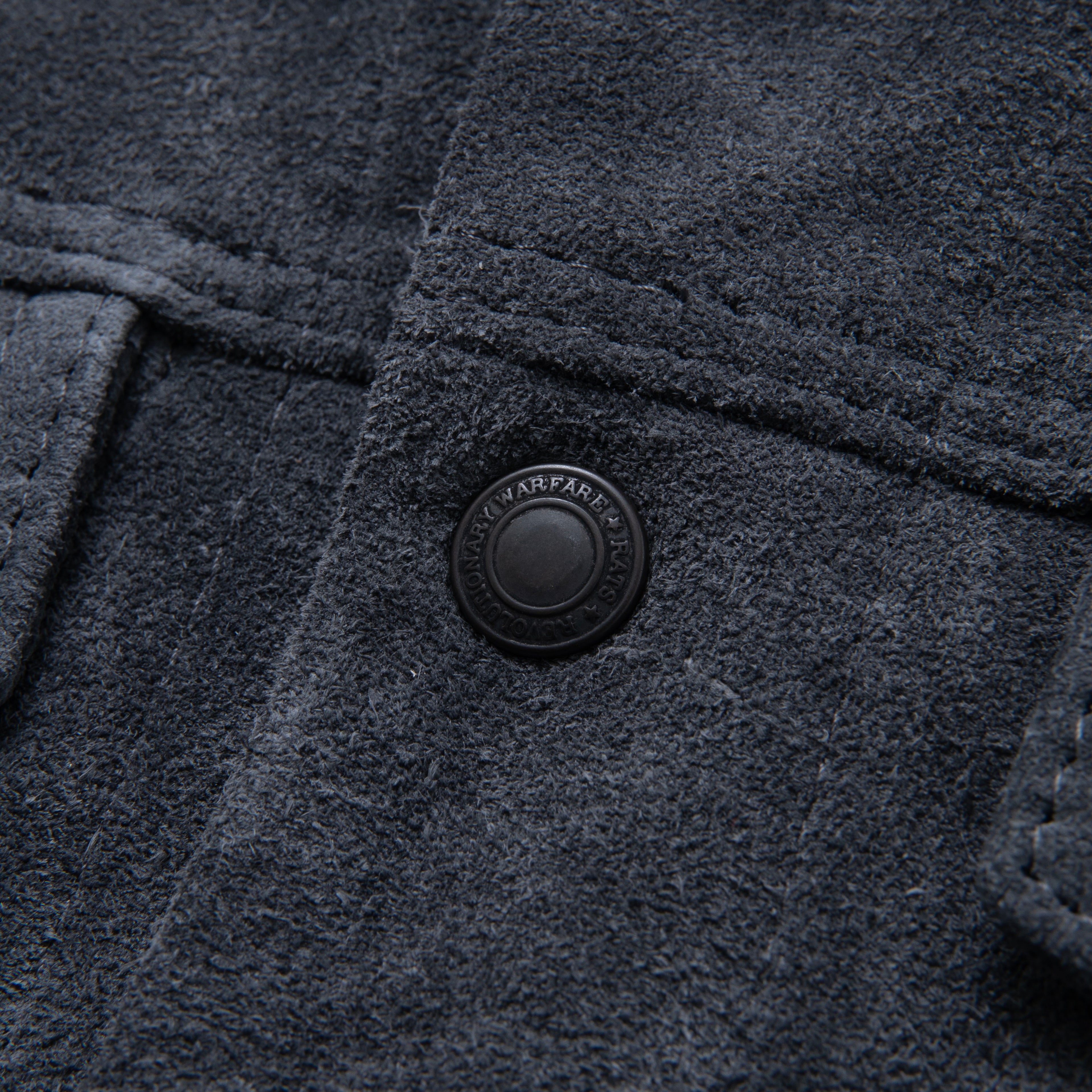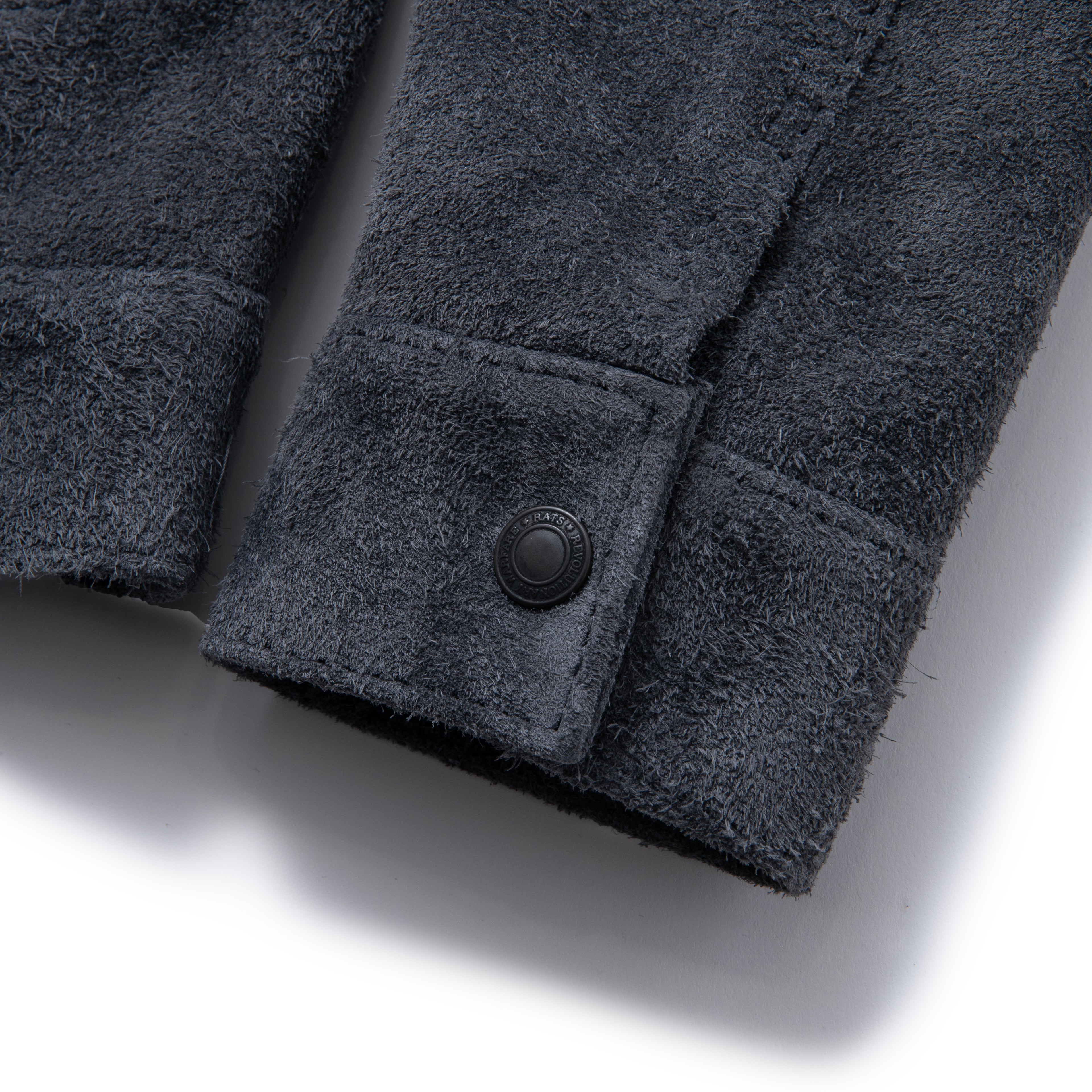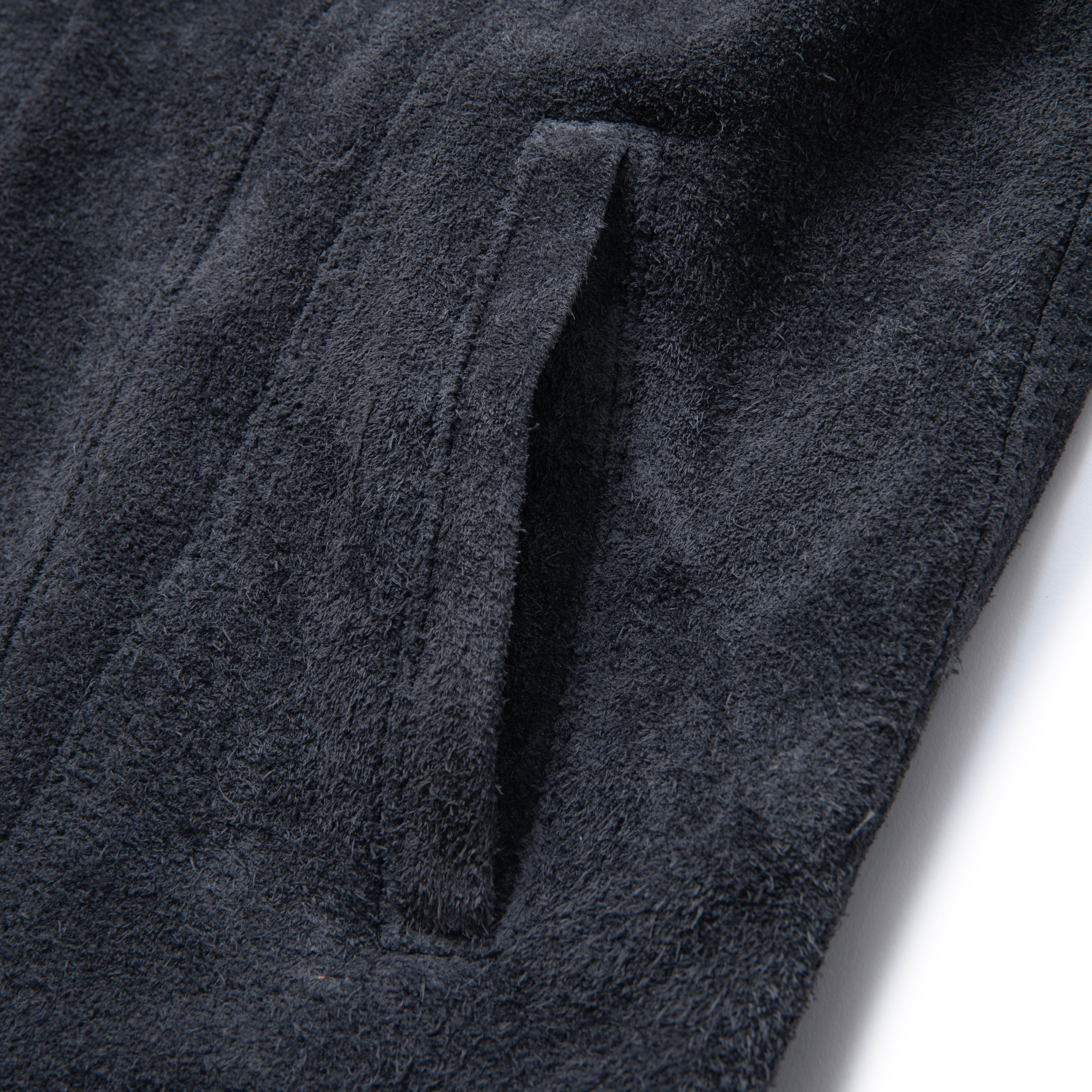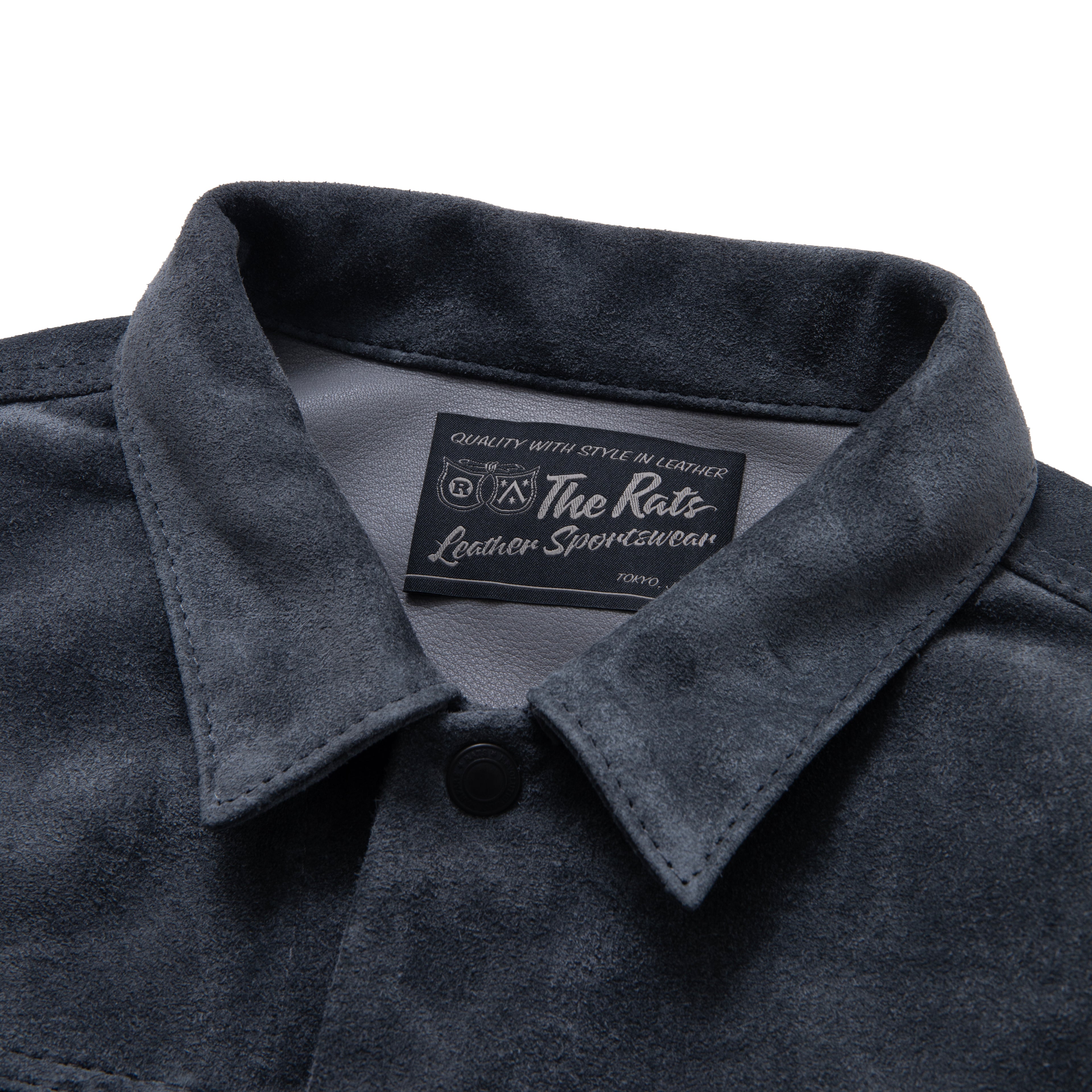 銀面の付いたカウスウェードを使用したトラッカータイプのレザージャケット。オリジナルレシピのグレーに染色を施した素材は、キメ細やかな質感が特徴。両胸にフラップポケット、両脇にスリットポケット、ウエストの両脇にアジャスターボタンを配置。フロントはスナップボタン仕様、スナップボタンはRATS・REVOLUTIONARY WALFAREの刻印が施されたオリジナル。背面タグはコットン生地にステッチワークを施した定番のデザイン。着用時に脇下から体に沿う様に計算された縦のラインが綺麗なボクシーなシルエット。1色5サイズ展開。