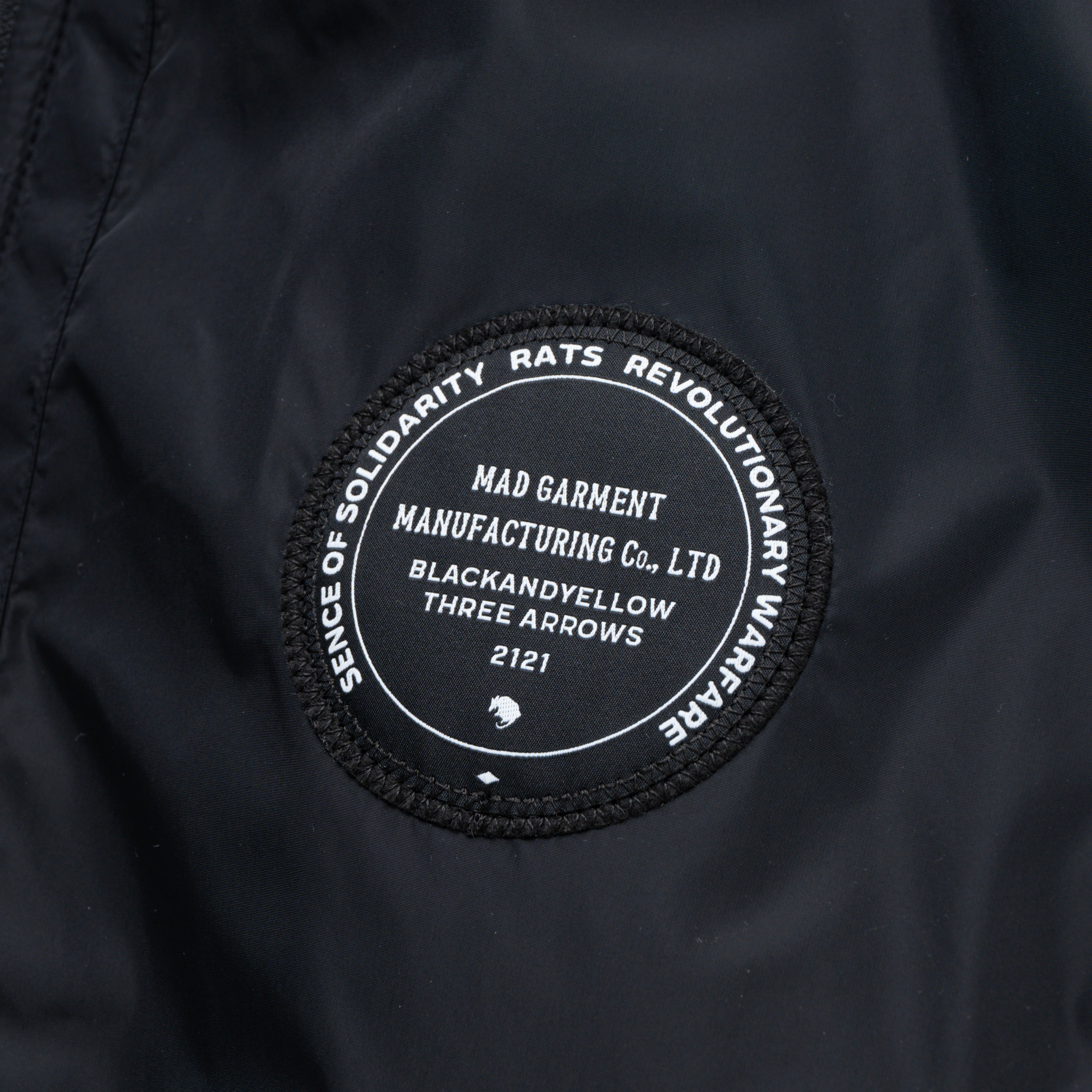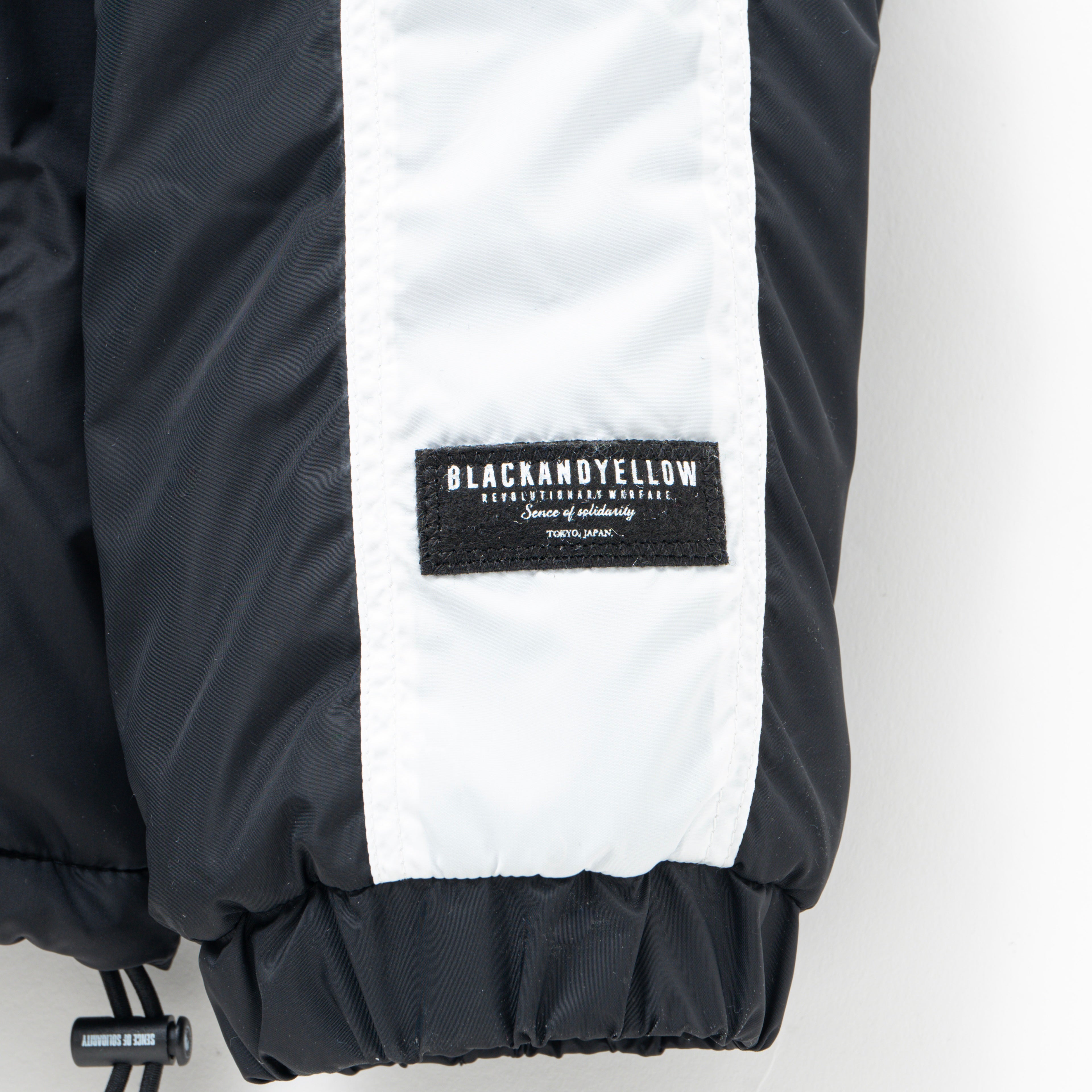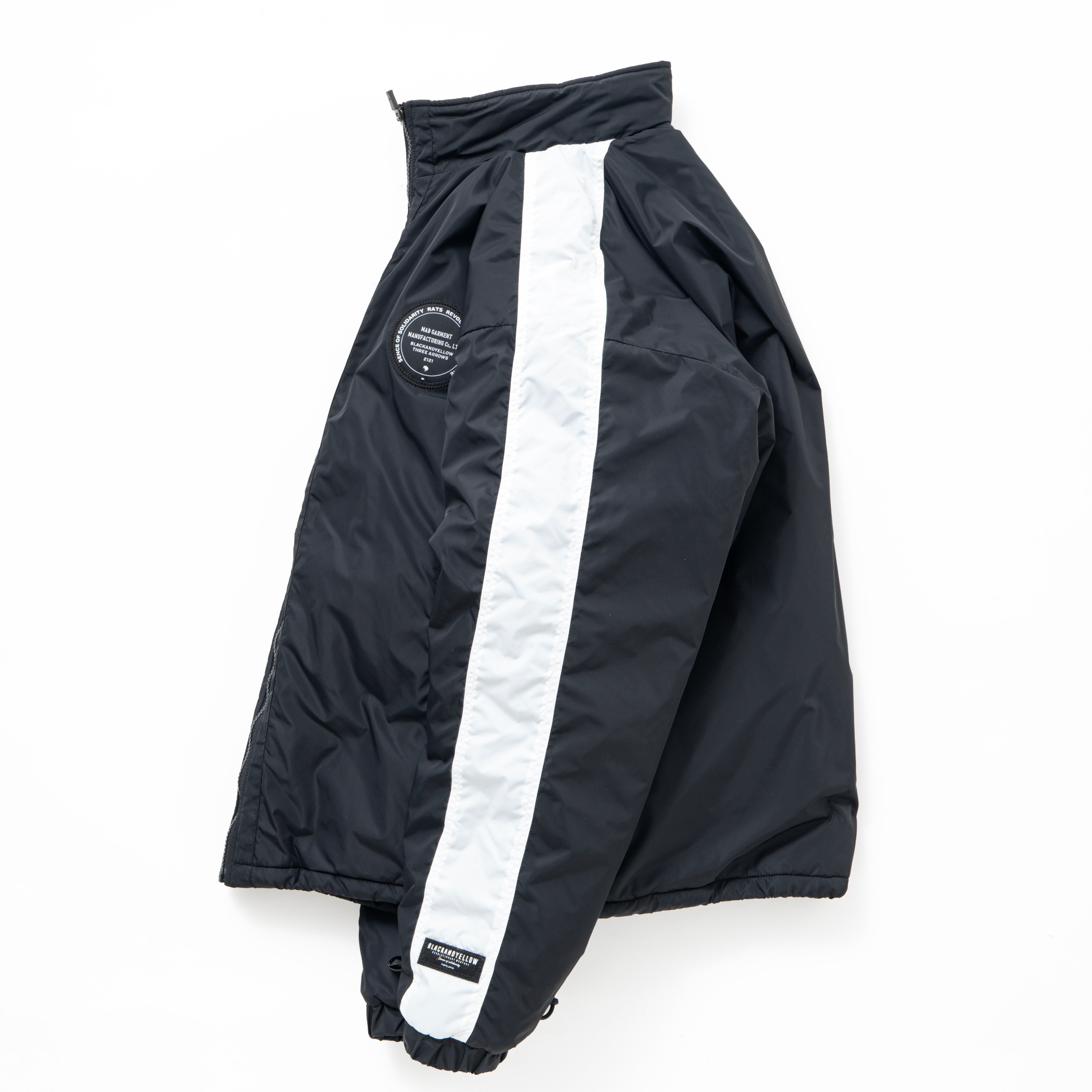 表地に撥水性のあるナイロン生地、裏地にはプリマロフト中綿入りのリップストップナイロン生地を使用したスタンドカラーのトラックジャケット。左胸にレターグラフィックを刺繍したサークル型フェルトワッペン、左袖にBLACK AND YELLOWを刺繍したフェルトワッペンを叩きつけ。両腕に身頃と配色を切り替えたラインテープを配置した仕様。裾両端にスピンドルが付属、シルエット調整が可能。身幅にゆとりのあるシルエット。1色5サイズ展開。