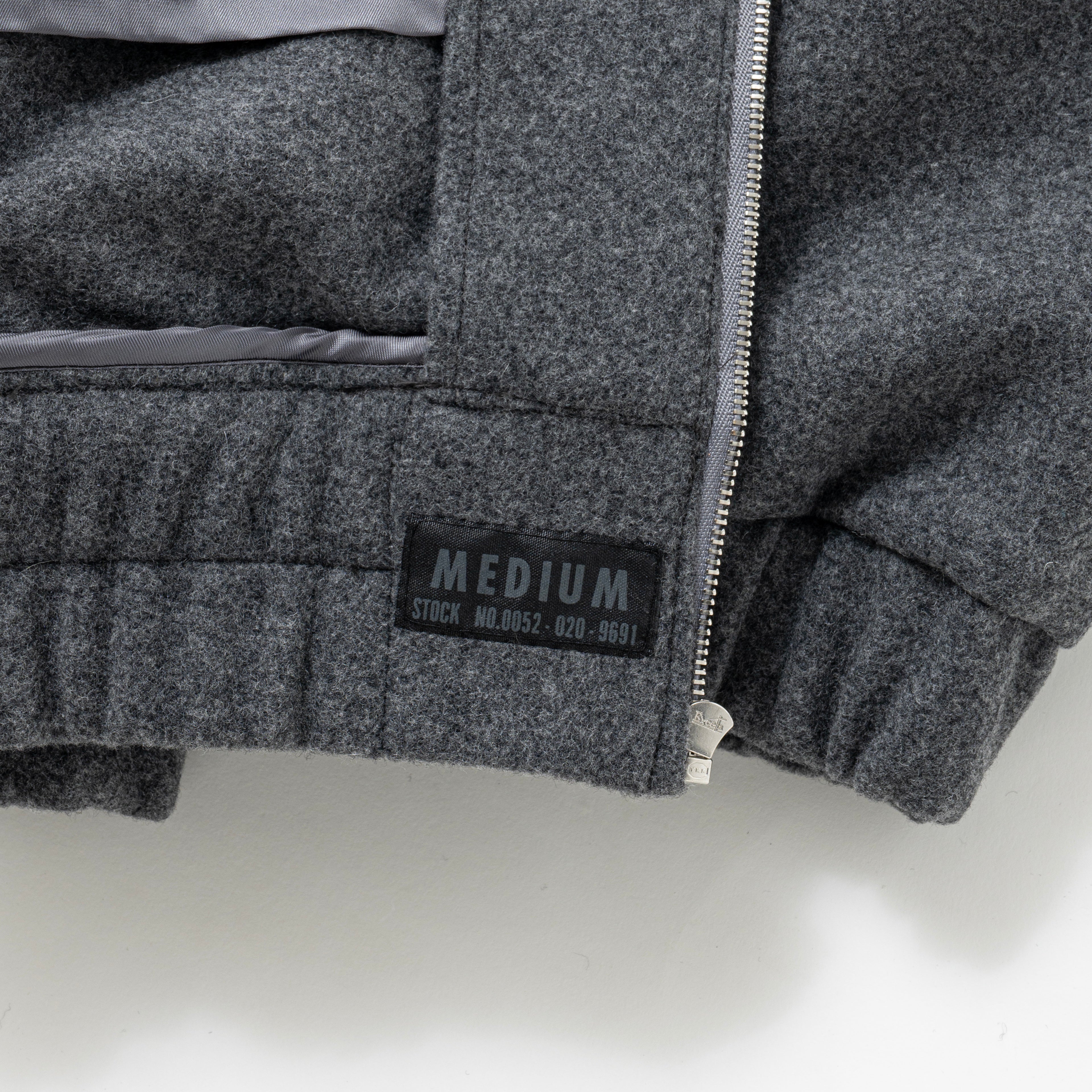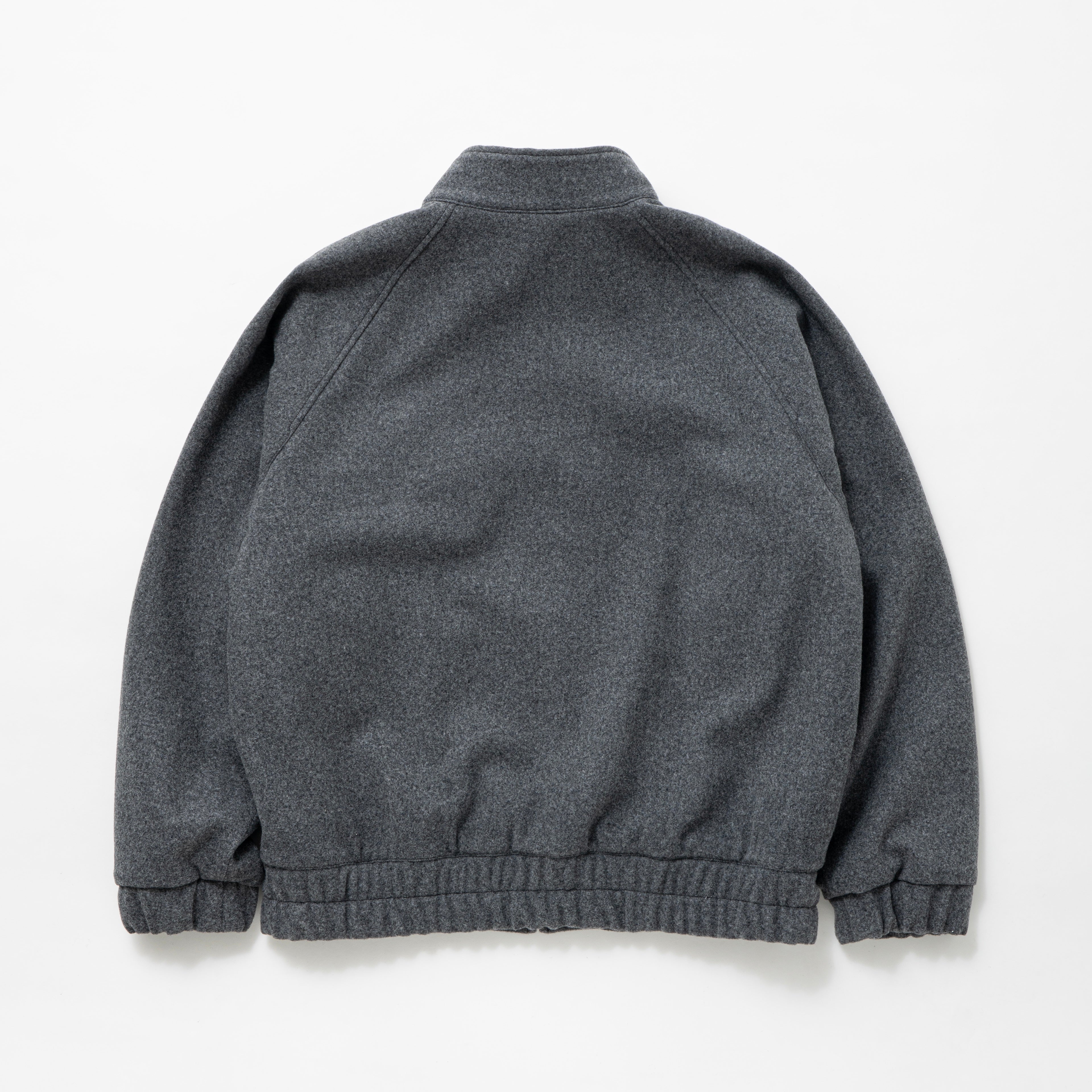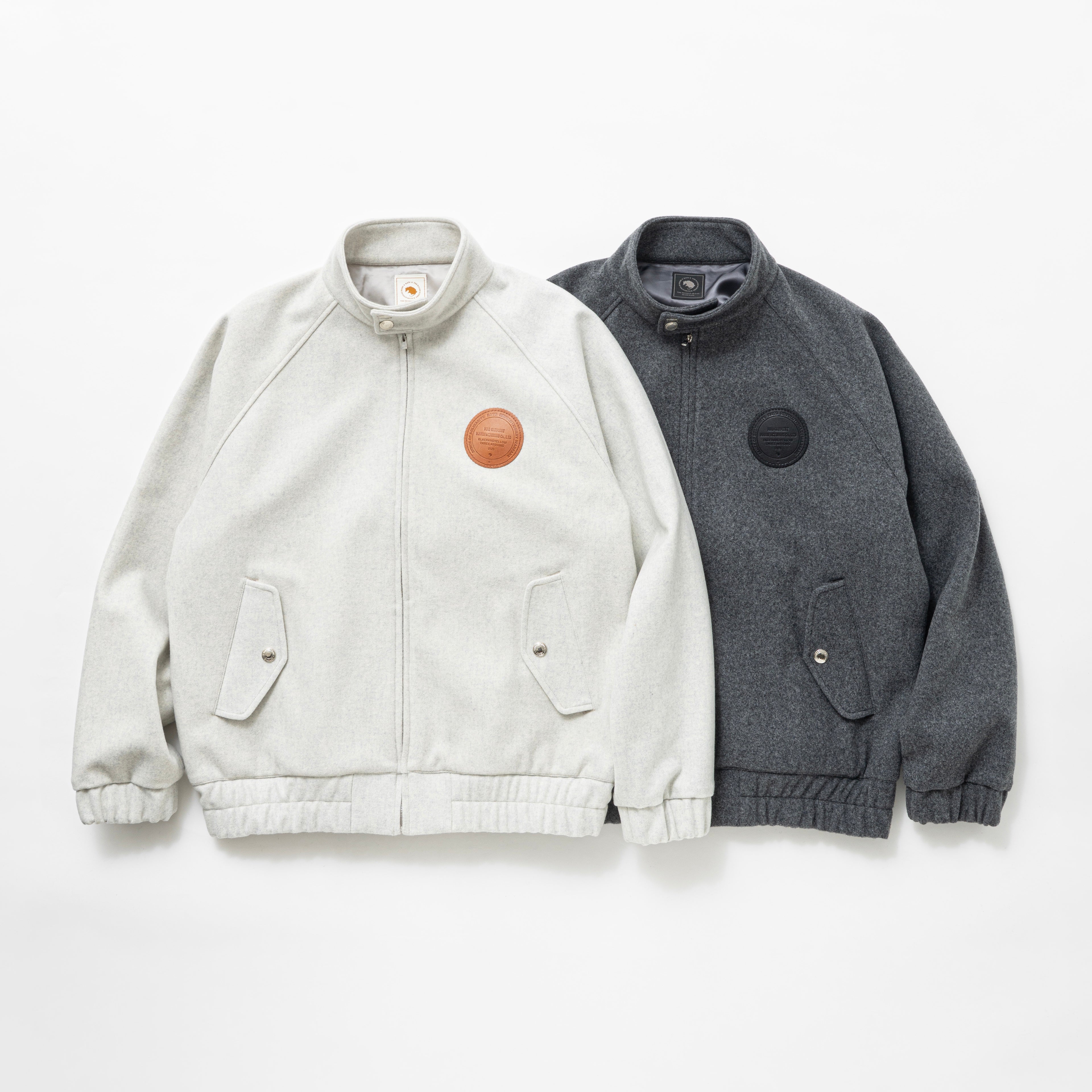 表地にピュアニューウールメルトン、裏地にキュプラを使用したラグジュアリーな表情のスウィングトップ。左胸にサークル型レザーパッチを千鳥刺繍で配置したデザイン。前立てはエクセラジップを採用、両脇にフラップポケット、身頃内側にファスナーポケット、袖・裾には太めに設定したゴムリブが付属する。ラグランスリーブ仕様、オーバーサイズシルエット。2色5サイズ展開。
