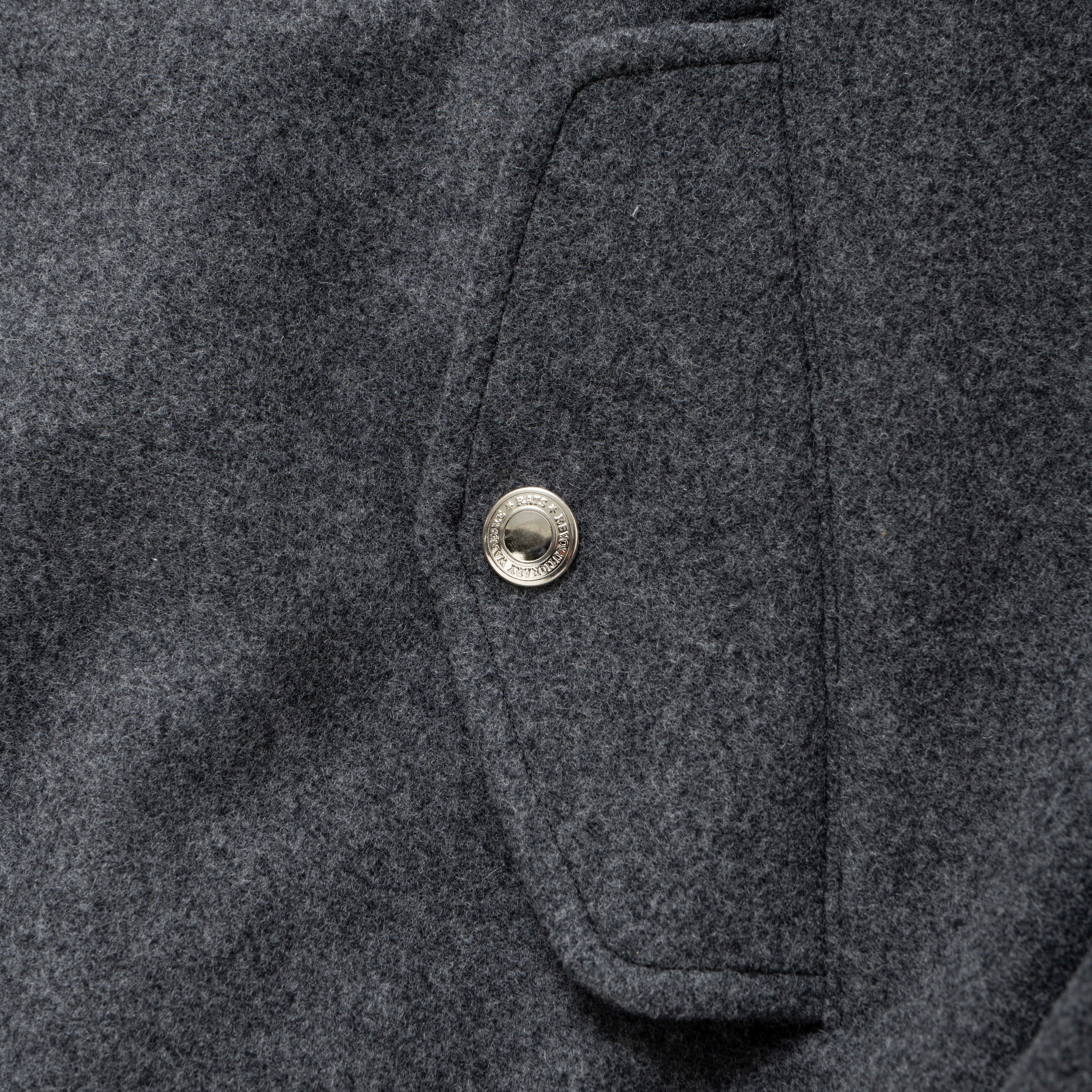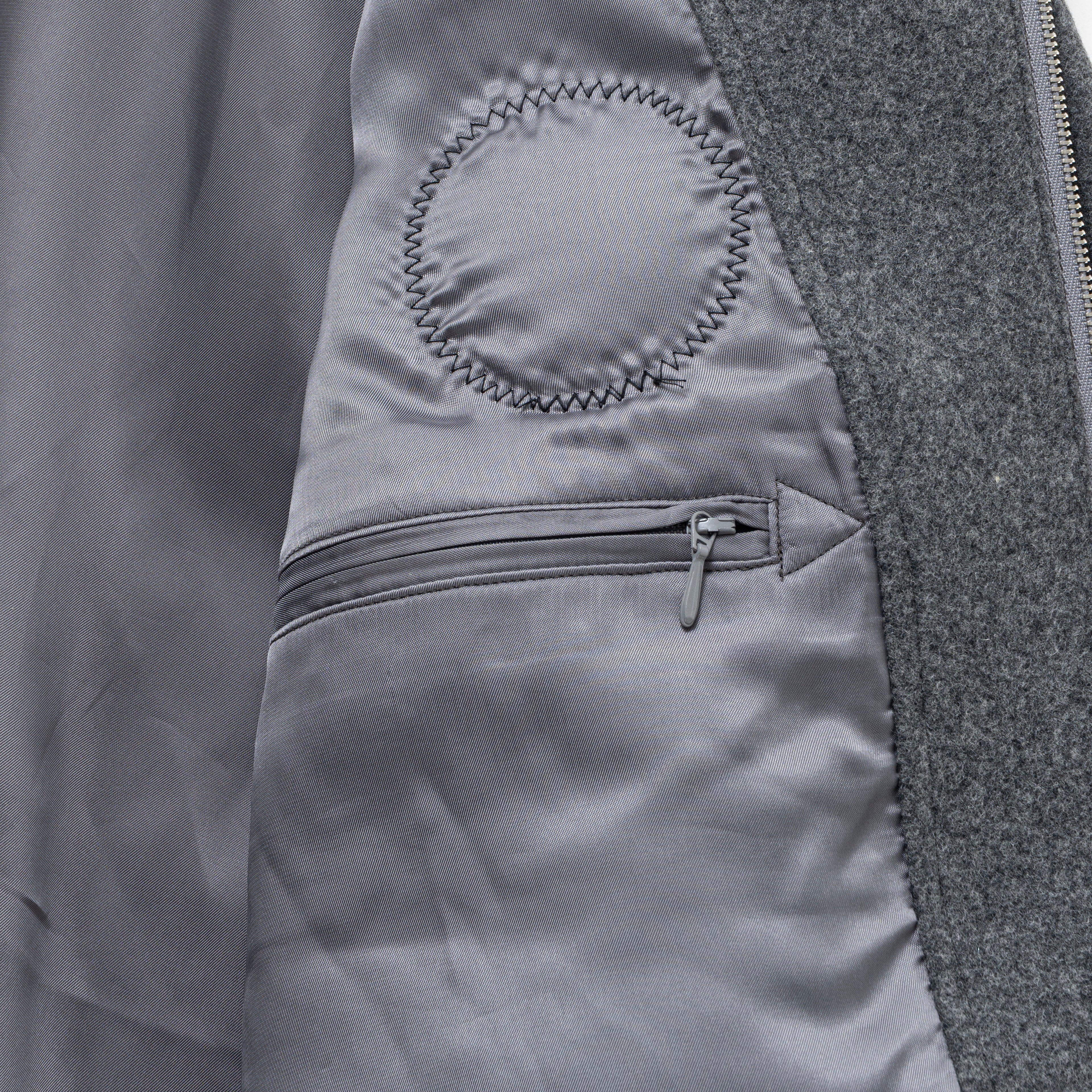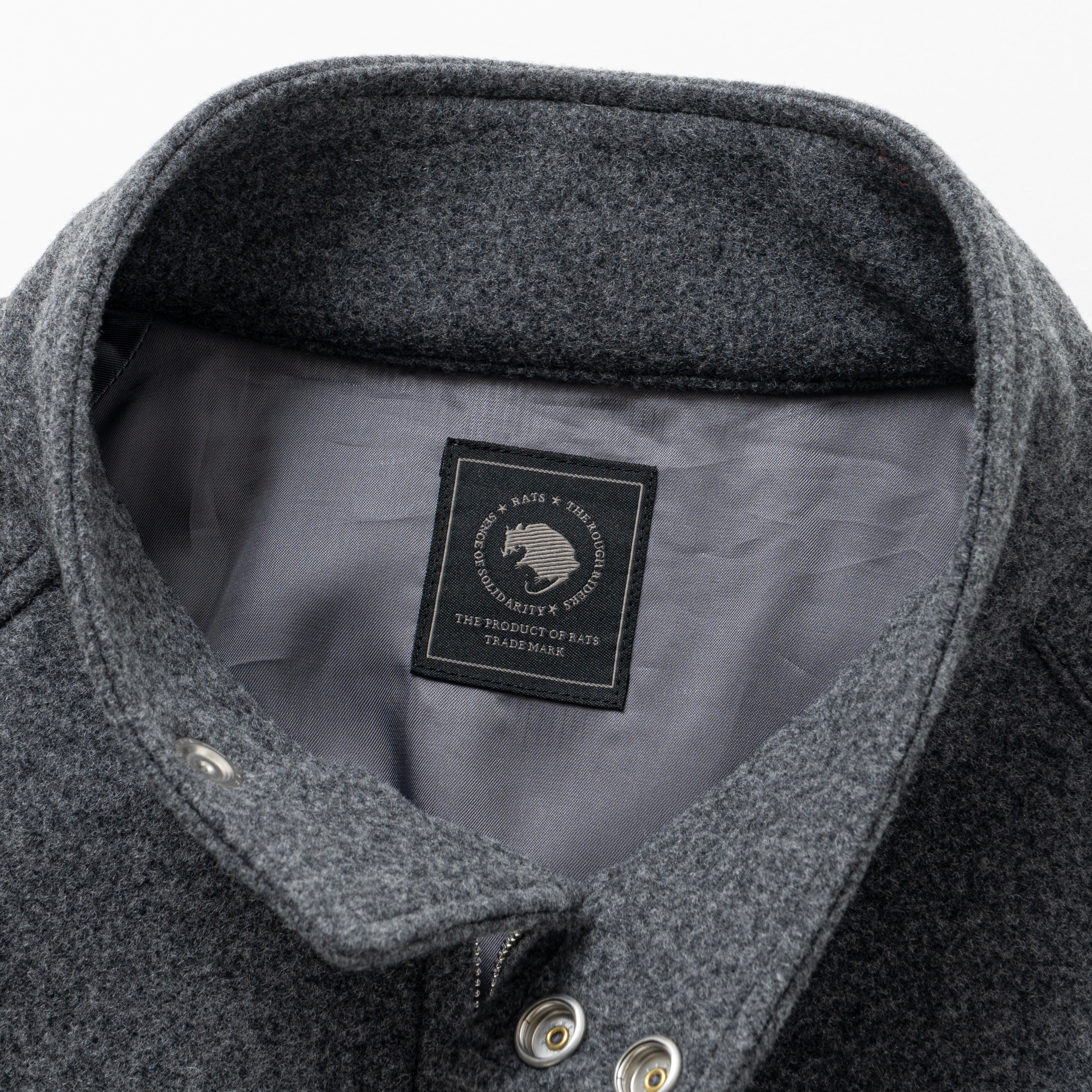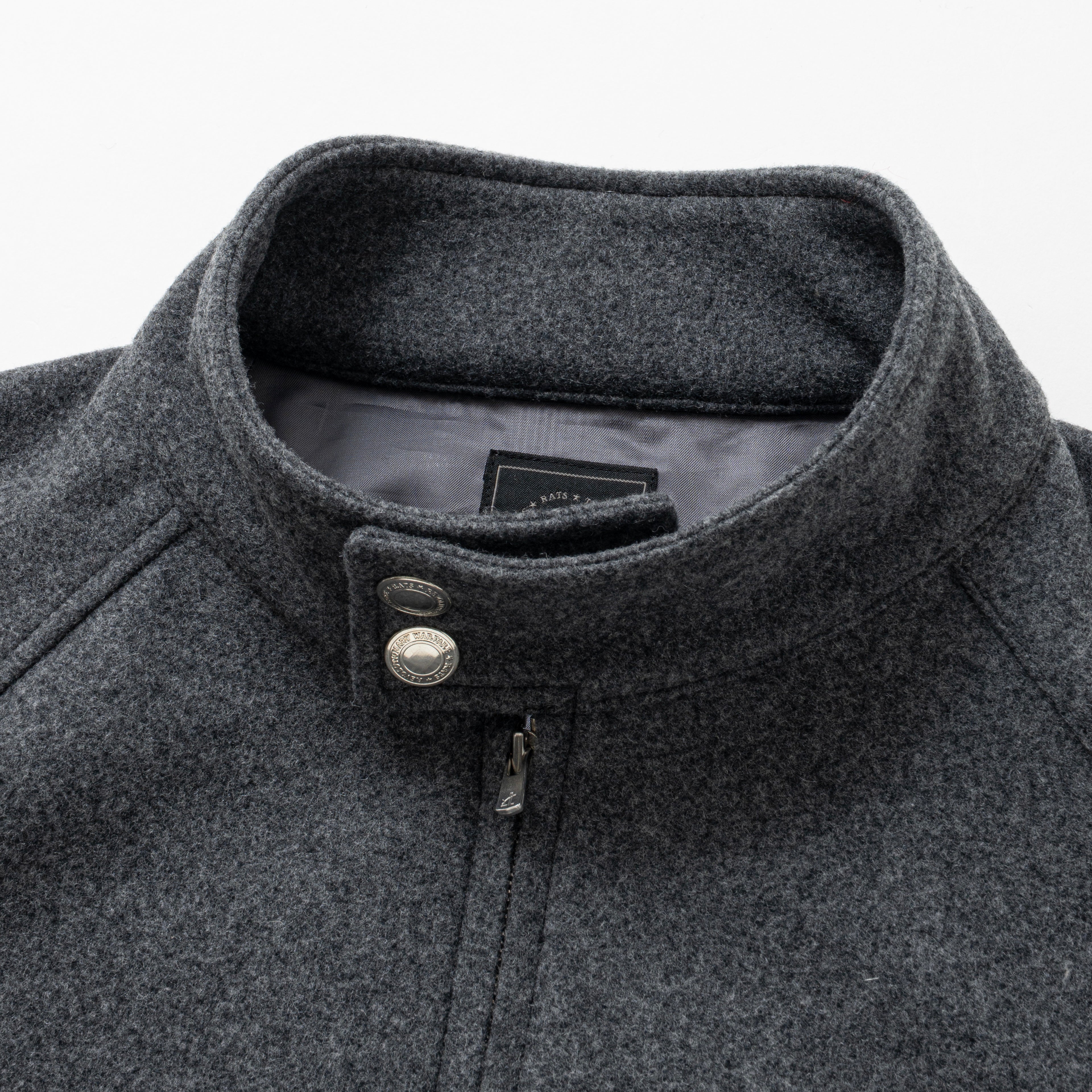表地にピュアニューウールメルトン、裏地にキュプラを使用したラグジュアリーな表情のスウィングトップ。左胸にサークル型レザーパッチを千鳥刺繍で配置したデザイン。前立てはエクセラジップを採用、両脇にフラップポケット、身頃内側にファスナーポケット、袖・裾には太めに設定したゴムリブが付属する。ラグランスリーブ仕様、オーバーサイズシルエット。2色5サイズ展開。