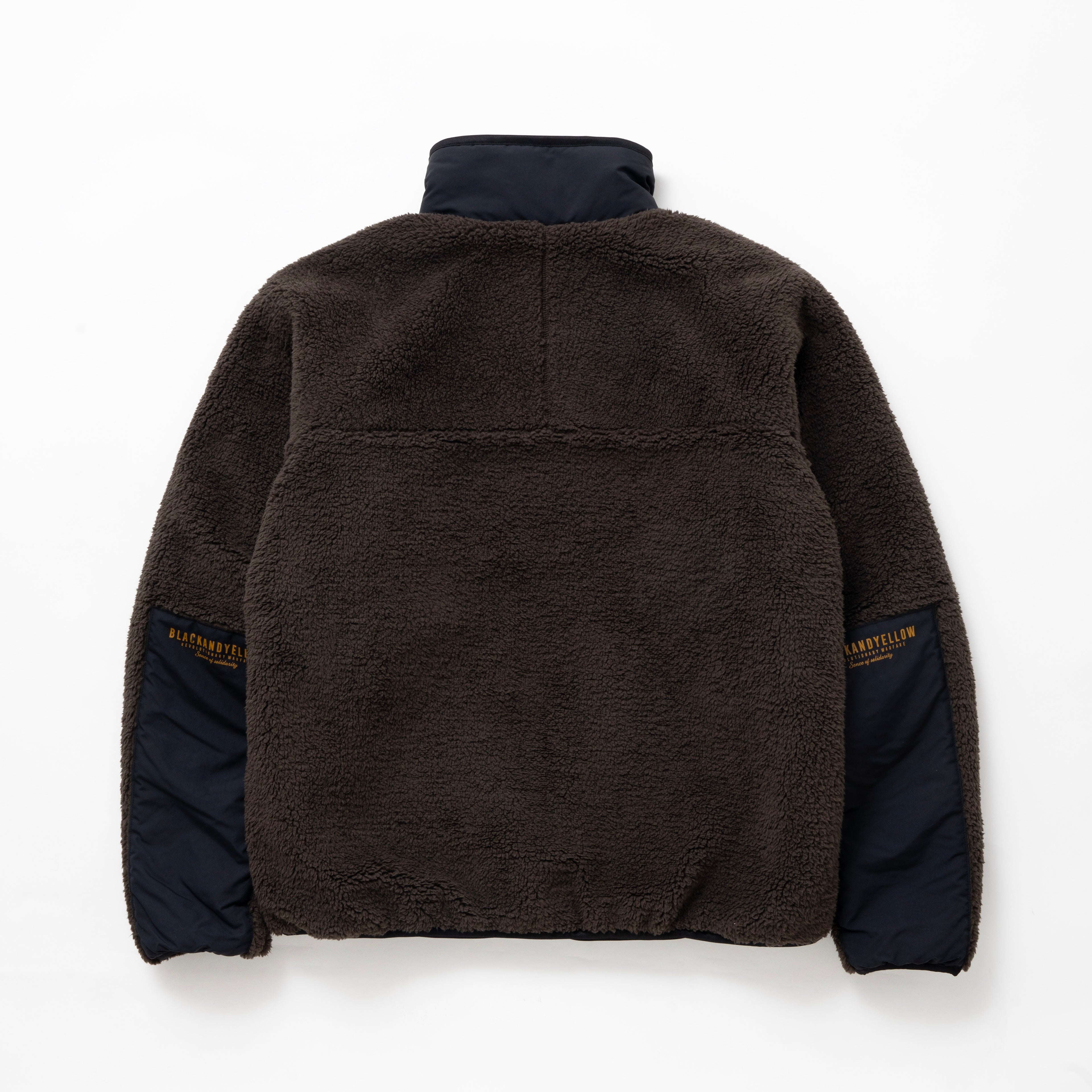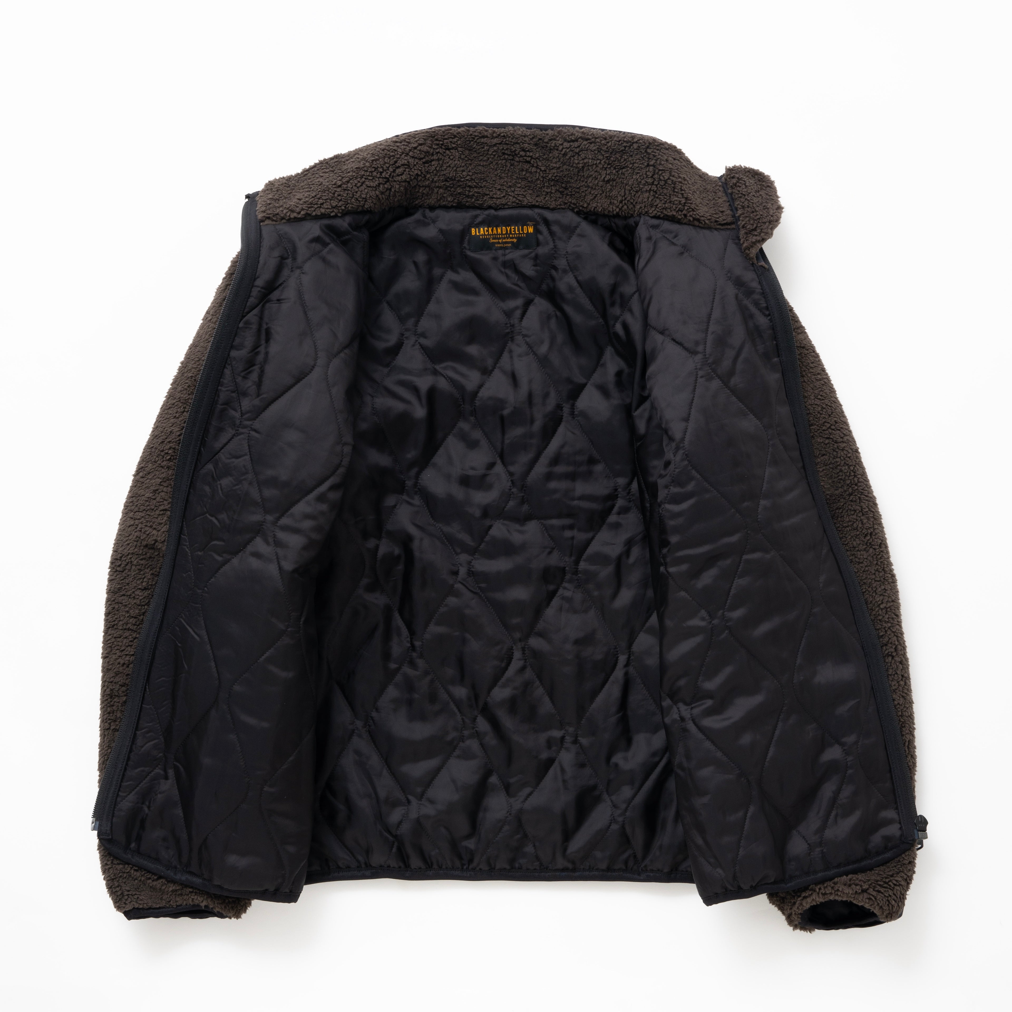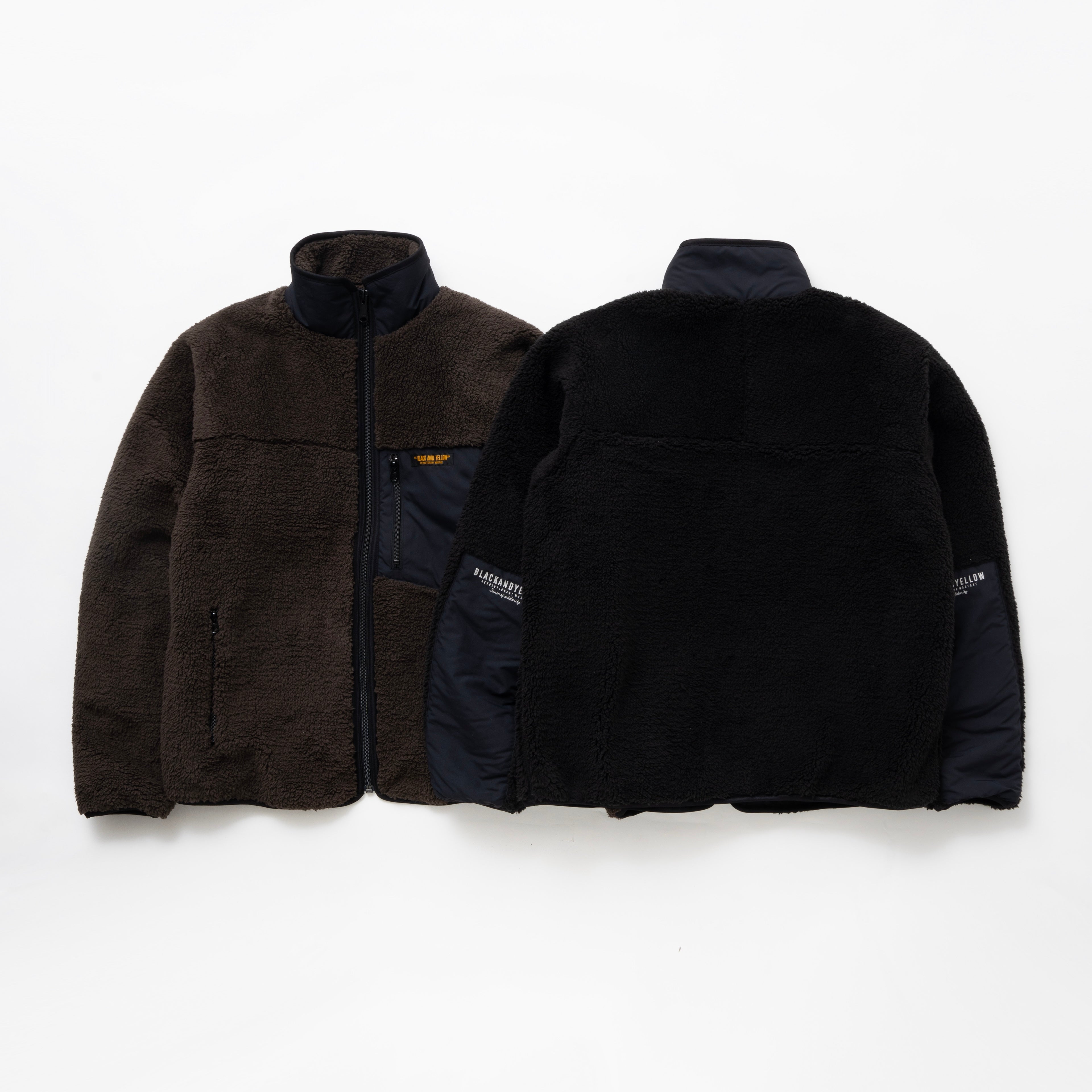 表地に肌触りの良い滑らか質感のポリエステル素材のフリース生地、裏地にはキュプラ素材のダイヤ型中綿キルティングを使用したジップアップフリースジャケット。左胸にファスナー付きポケット、両脇にファスナー付きポケットを配置。襟、胸ポケット、肘当てには撥水性のあるナイロン生地を使用し、身頃と素材切り替えを施したデザイン。肘当て部分にはBLACK AND YELLOWのレターグラフィックをラバープリント。身幅にややゆとりのあるシルエット。2色5サイズ展開。