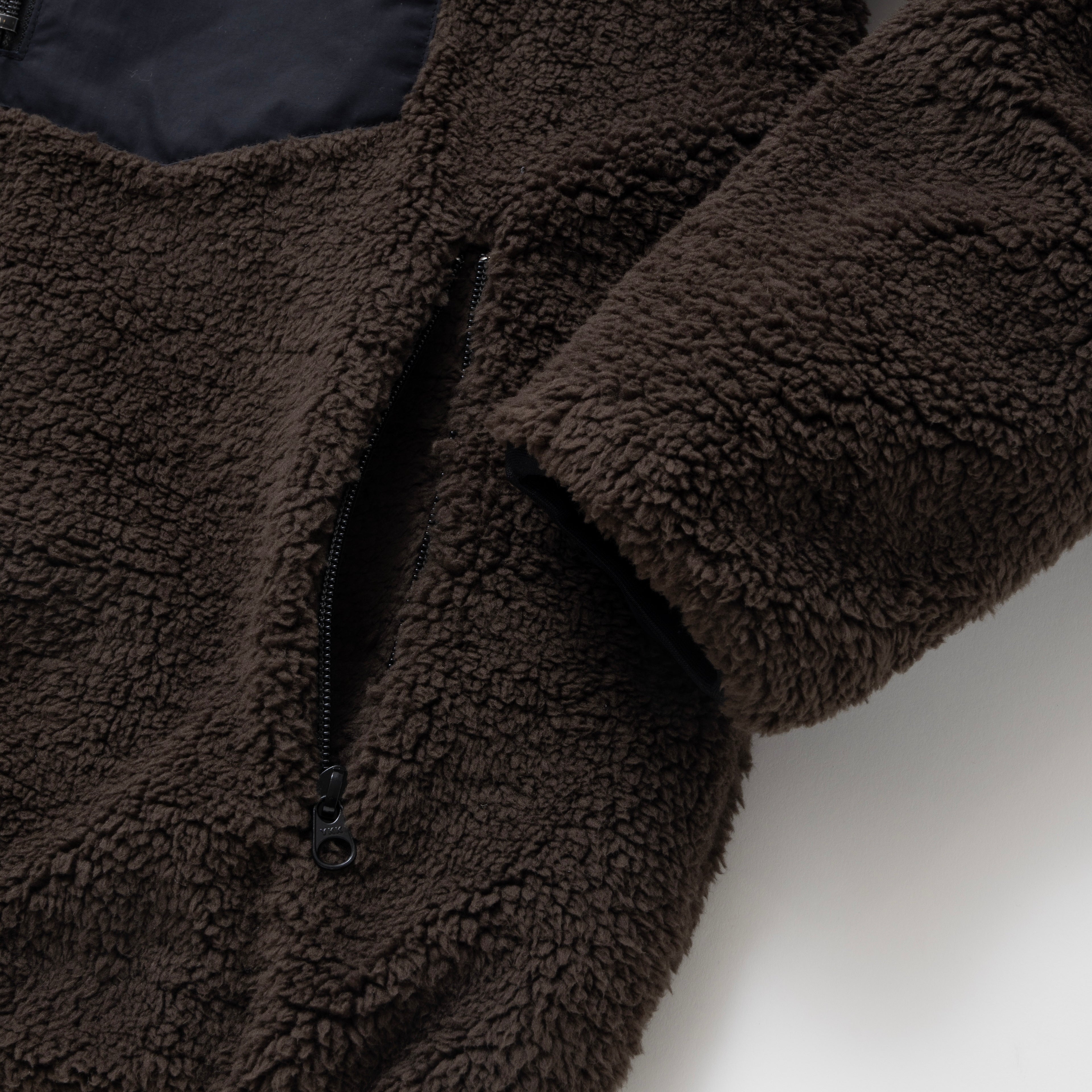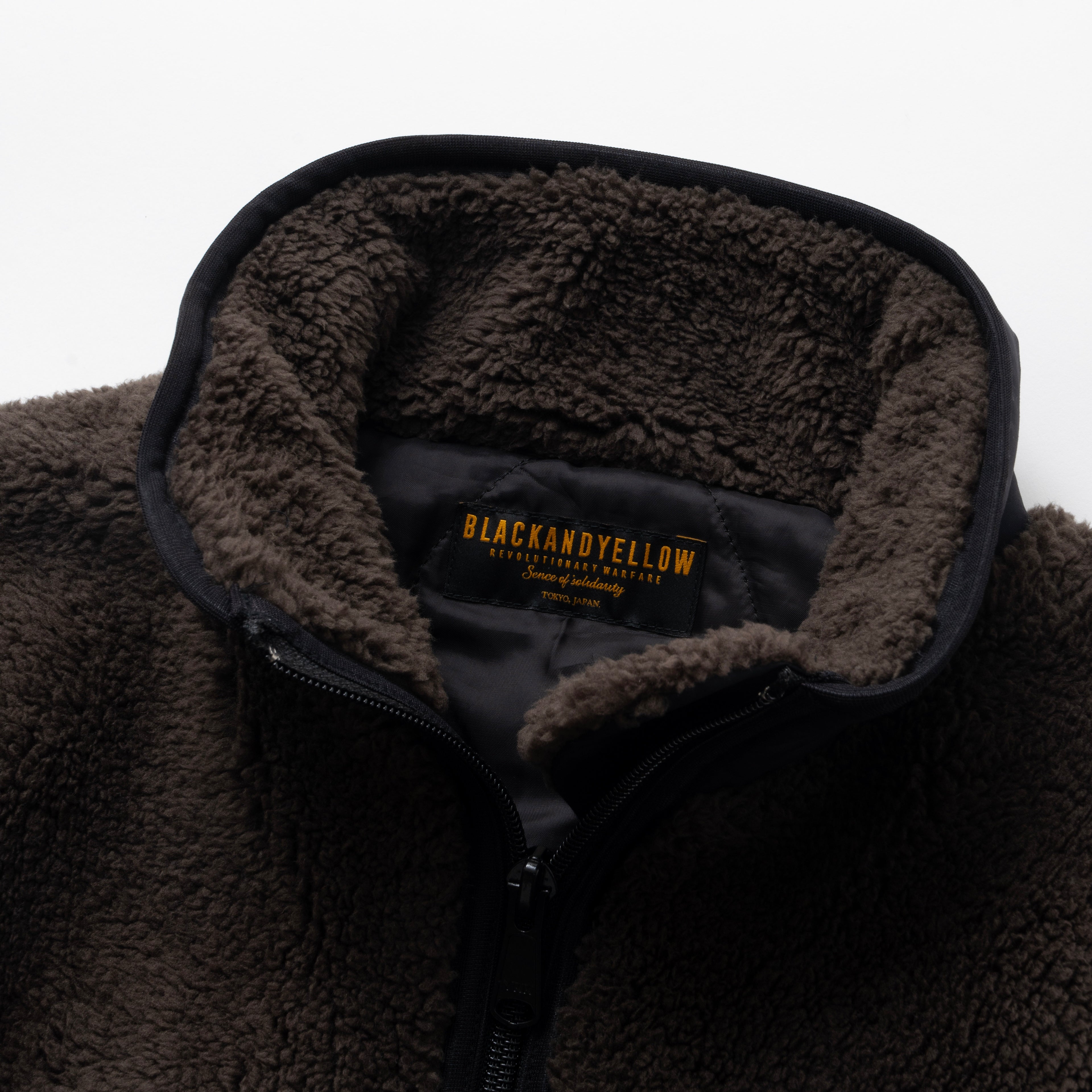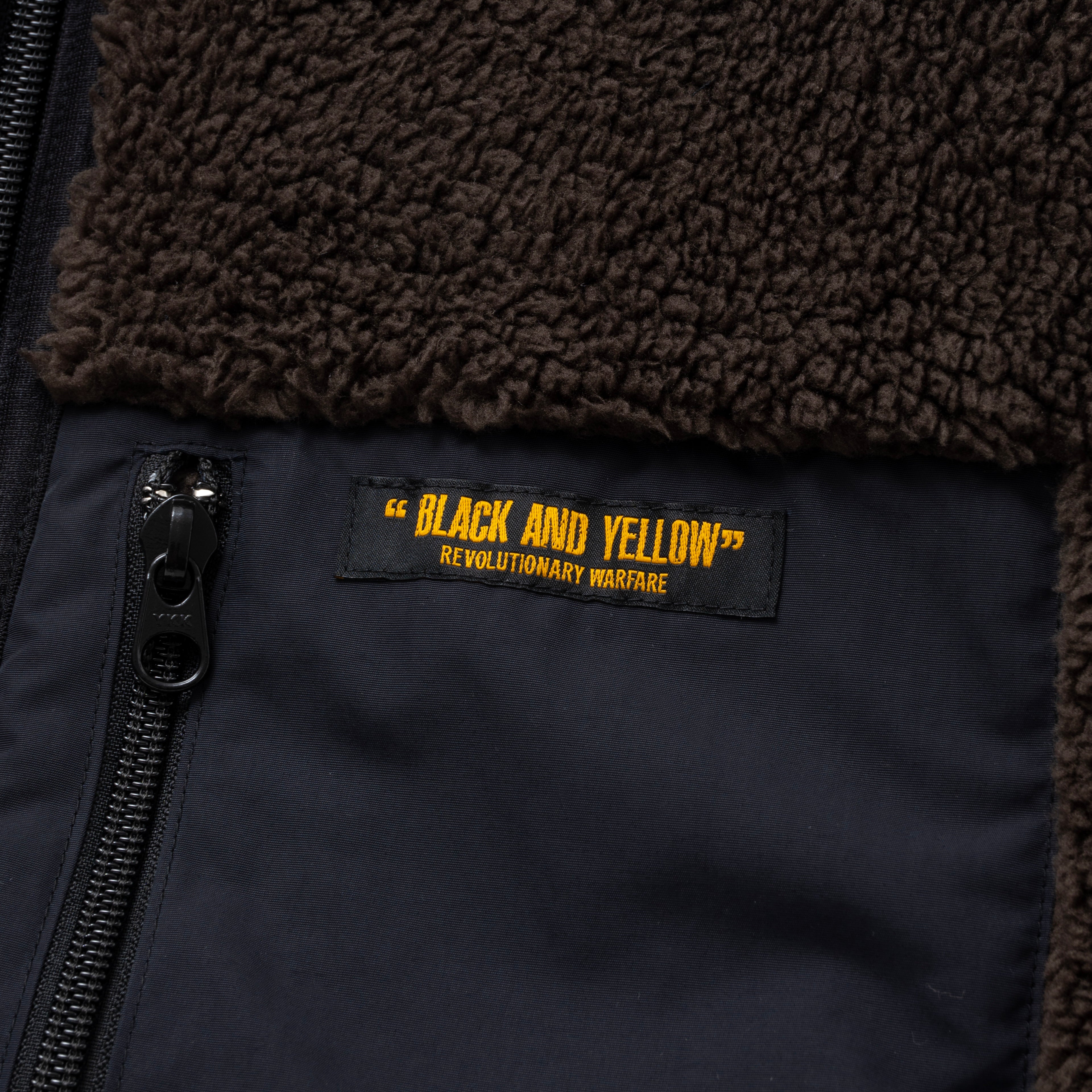 表地に肌触りの良い滑らか質感のポリエステル素材のフリース生地、裏地にはキュプラ素材のダイヤ型中綿キルティングを使用したジップアップフリースジャケット。左胸にファスナー付きポケット、両脇にファスナー付きポケットを配置。襟、胸ポケット、肘当てには撥水性のあるナイロン生地を使用し、身頃と素材切り替えを施したデザイン。肘当て部分にはBLACK AND YELLOWのレターグラフィックをラバープリント。身幅にややゆとりのあるシルエット。2色5サイズ展開。